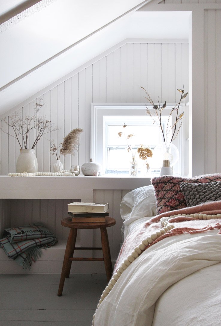 “This is a guest room on the second floor that feels like an attic loft in the best way,” Tara says. “The ceiling was already blown out like that when we got there and looked pretty great, but was painted blue with exposed beams, which sounds cool but wasn’t. We painted the whole room white and Percy added the built-in window seats and nooks next to the bed. I almost forgot we had added until I wrote this, because they seem so original to the space!”