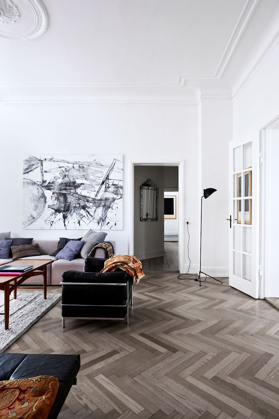 Familien har bodd her siden 2009, og paret falt for de mange fine detaljene i den klassiske 1900-tallsleiligheten – som stukkatur i taket, store vinduer og fiskebens-parkett. Bad og kjøkken er blitt behørig modernisert, og skaper en strømlinjeformet kontrast til den gamle herskapsleiligheten.